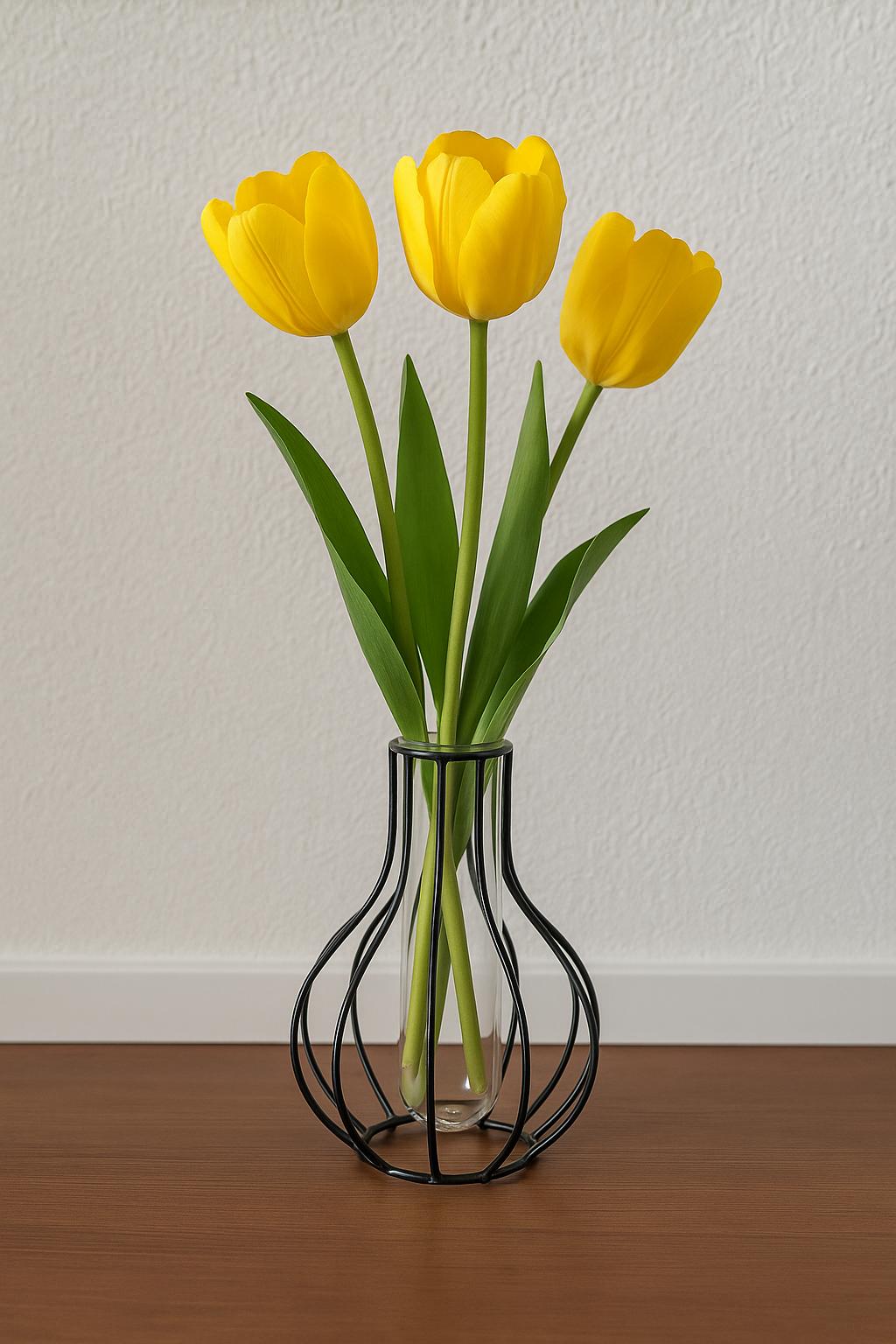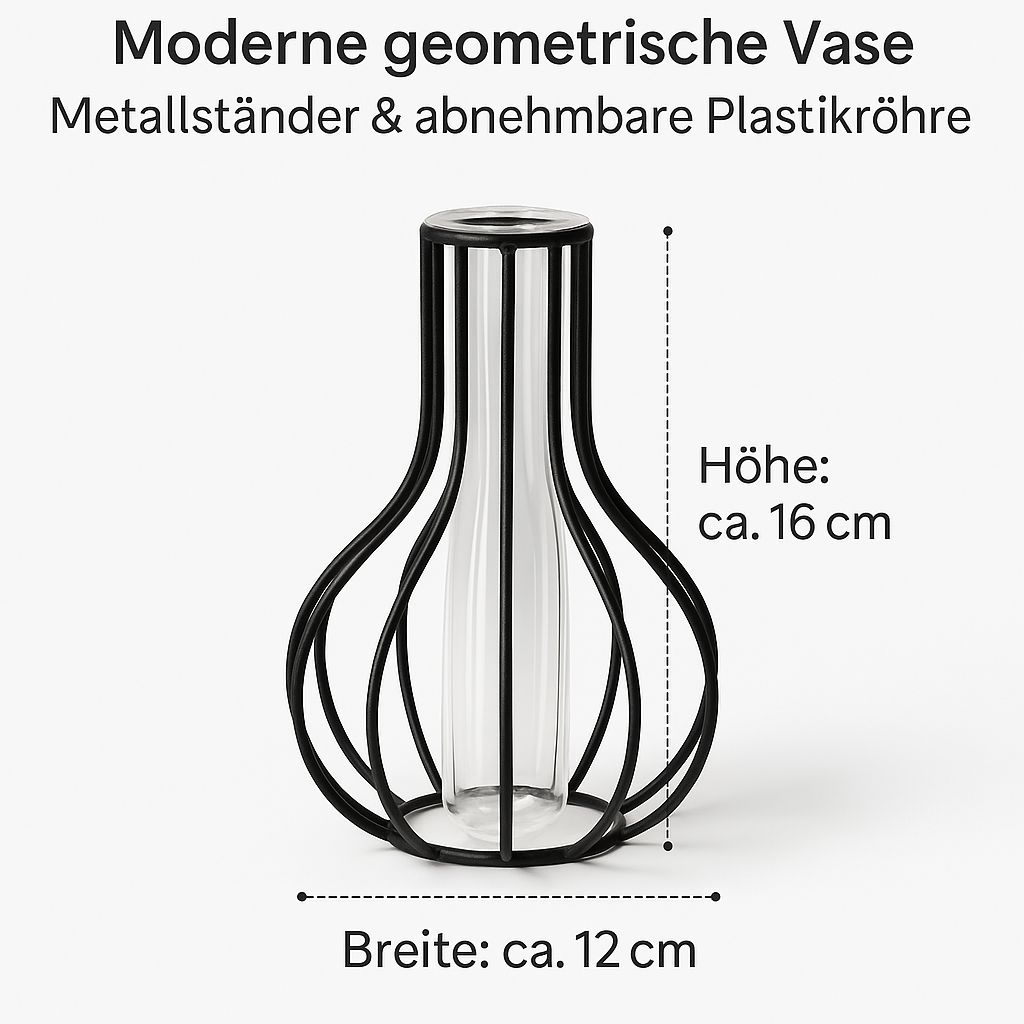 Moderne geometrische Vase mit schwarzem Metallständer und transparenter Plastikröhre.