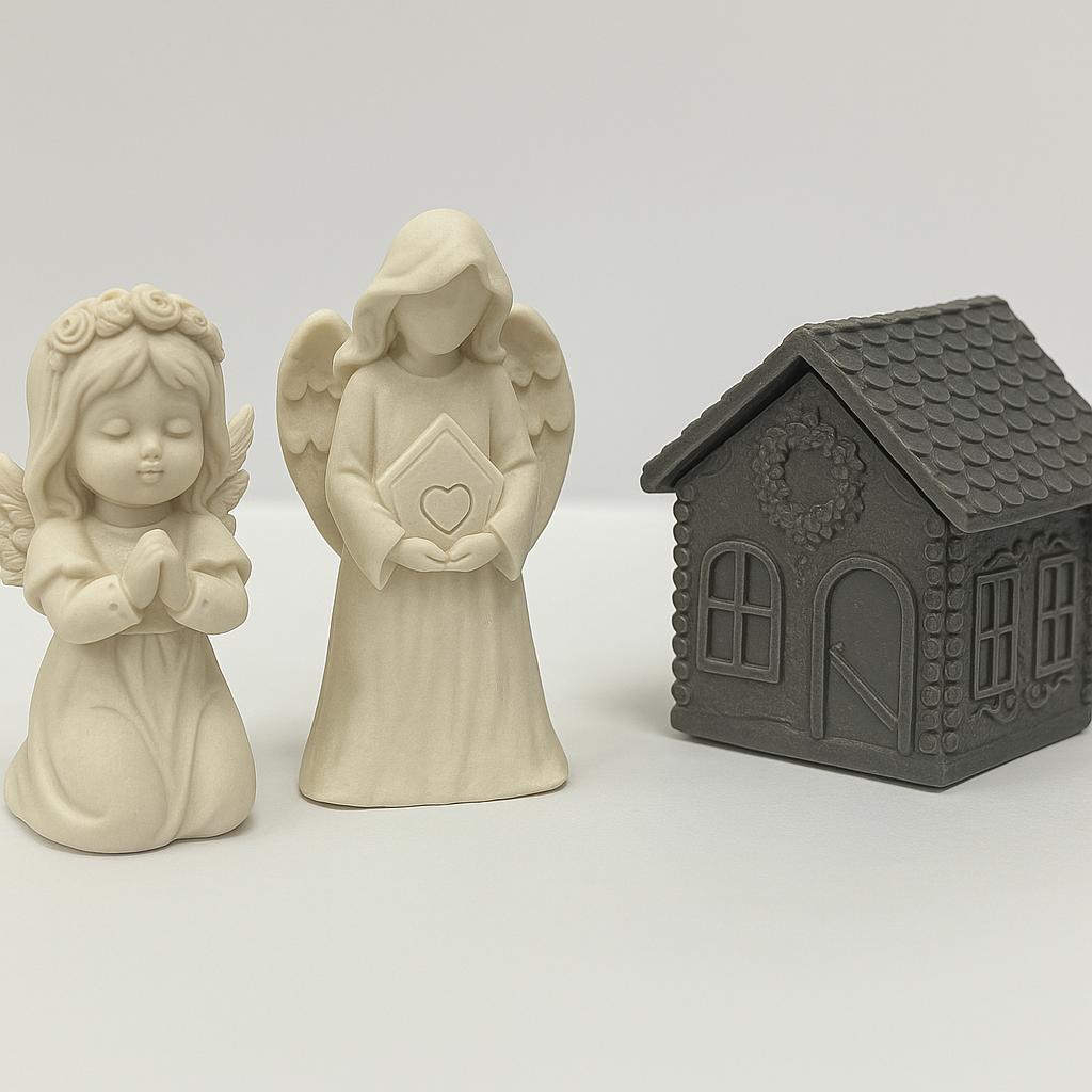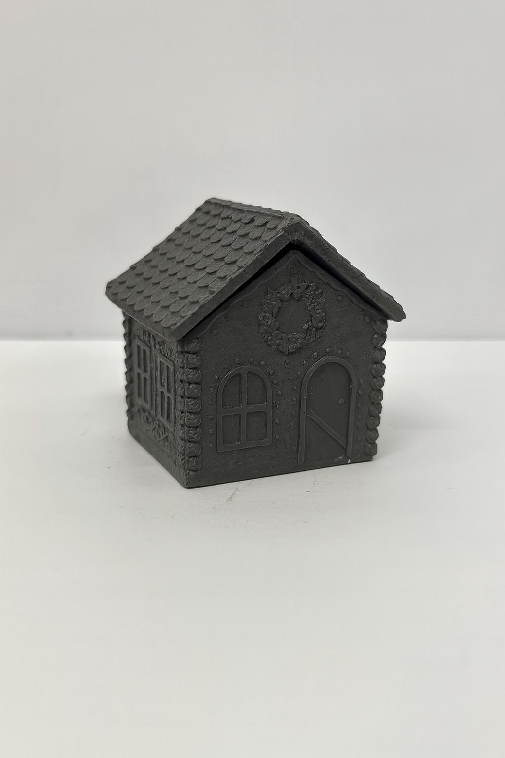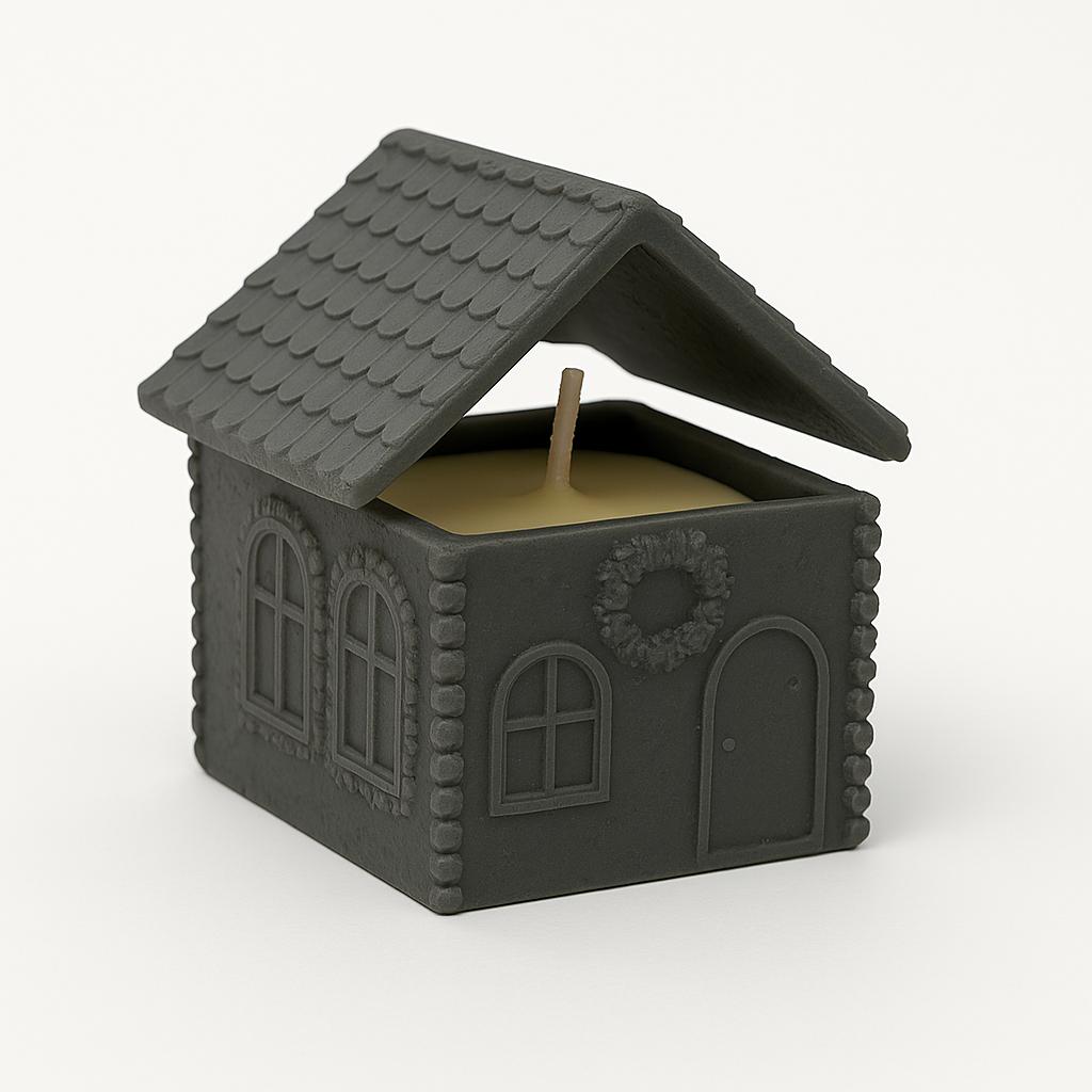 Handgefertigtes Deko-Häuschen mit Duftkerze im Inneren – erhältlich in Dunkelgrau, Terrakotta und Weiss.