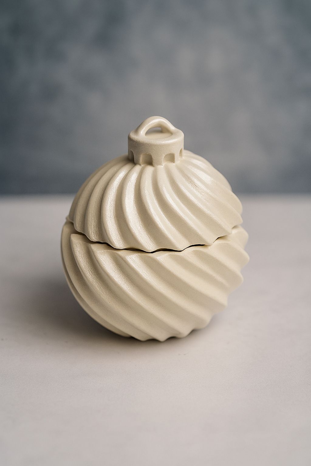 Elegante Keramikkugel mit Bio-Kokoswachs, handgefertigt und perfekt als festliche Geschenkidee. Maße: 7 cm Durchmesser, 9 cm Höhe. Stilvoll, natürlich und dekorativ.